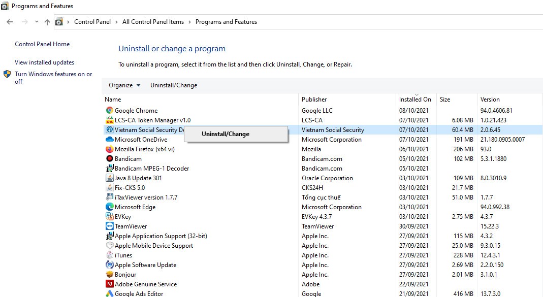 Bước 1: Gỡ bỏ ứng dụng nền ký số cũ: vào Start Menu Windows 10 Start Button Icon Download #6431 - Free Icons Library – -> ControlPanel Tập tin:Windows Control Panel Icon.png – Wikipedia tiếng Việt  --> Programs and Features --> click chuột phải chọn “Vietnam Social Security Declaration” --> Uninstall/Change (như hình)